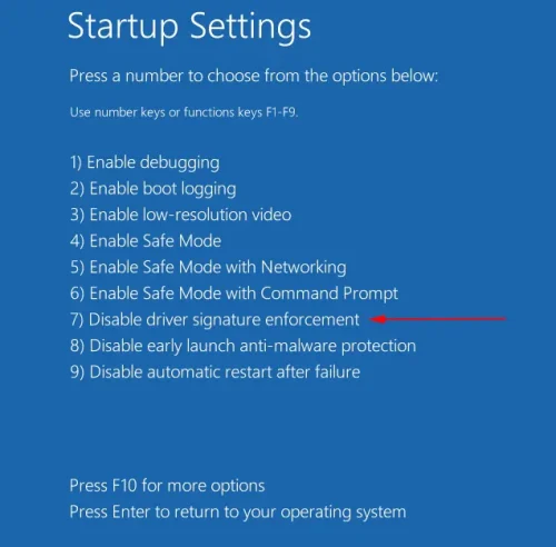 - When prompted, press F7 or 7 to select Disable Driver Signature Enforcement.